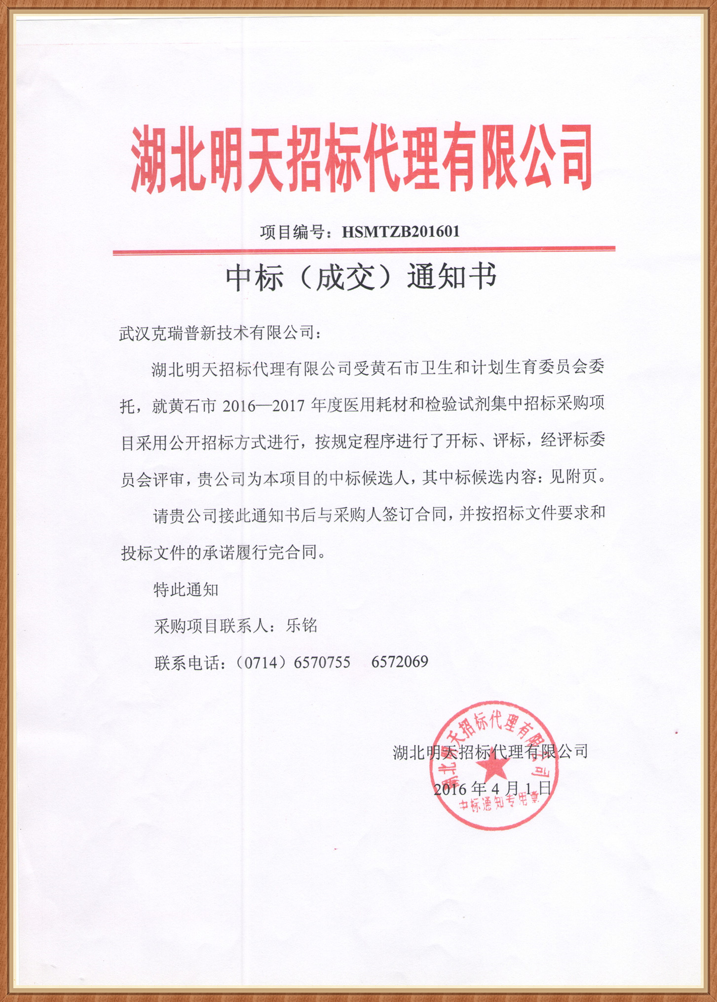 湖北省黃石市醫(yī)用耗材和檢驗(yàn)試劑集中招標(biāo)采購中標(biāo)通知書
