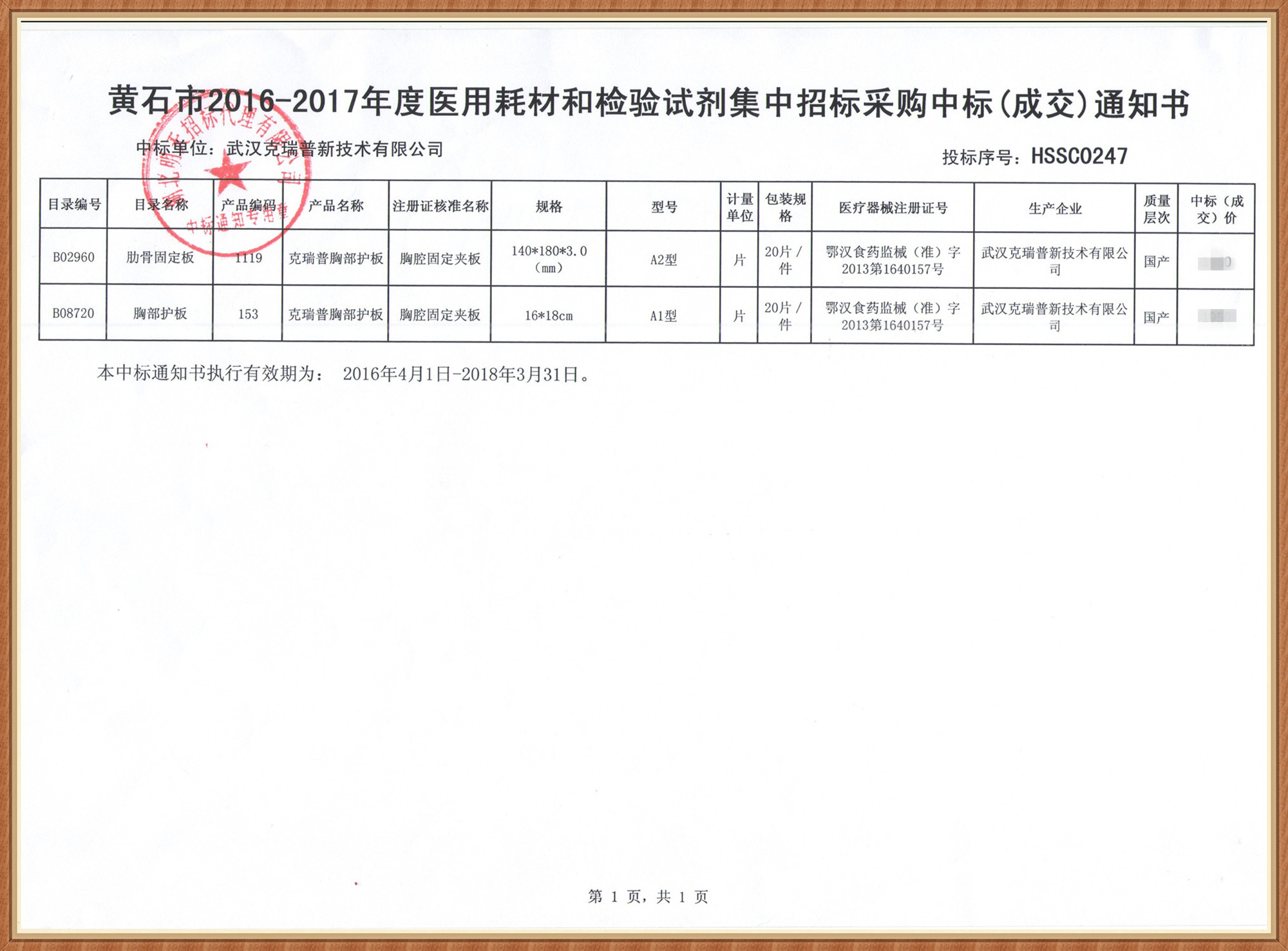 【湖北省黃石市醫(yī)用耗材和檢驗(yàn)試劑集中招標(biāo)采購中標(biāo)通知書】武漢克瑞普新技術(shù)有限公司在黃石市2016-2017年度醫(yī)用耗材和實(shí)驗(yàn)試劑集中招標(biāo)采購項(xiàng)目中按程序進(jìn)行評標(biāo)以及評標(biāo)委員會的評定已成功中標(biāo),我們在本次采購中標(biāo)了肋骨固定板(規(guī)格:140*180*3.0 型號:A2型)以及胸部護(hù)板(規(guī)格:16*18 型號:A1型)兩種骨科耗材產(chǎn)品。