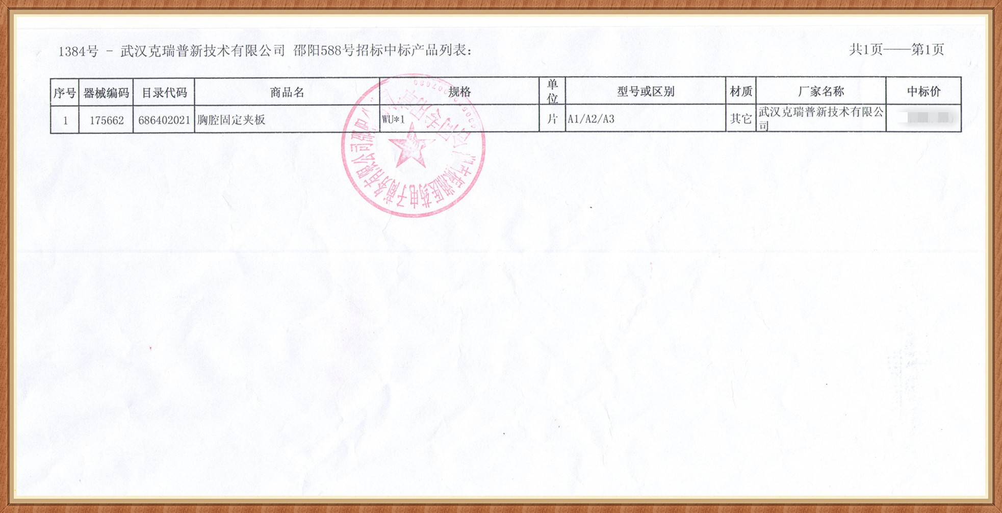 【湖南省邵陽市588號(hào)招標(biāo)】我們武漢克瑞普新技術(shù)有限公司的胸前固定夾板產(chǎn)品已經(jīng)在湖南省邵陽市588號(hào)招投標(biāo)中成功中標(biāo)產(chǎn)品展示,我們這次中標(biāo)的胸腔固定夾板產(chǎn)品型號(hào)分為A1/A2/A3三種型號(hào),此產(chǎn)品已在多家醫(yī)院和診所采取了臨床使用,產(chǎn)品反應(yīng)良好歡迎其他的醫(yī)院以及經(jīng)銷商等來采購。
