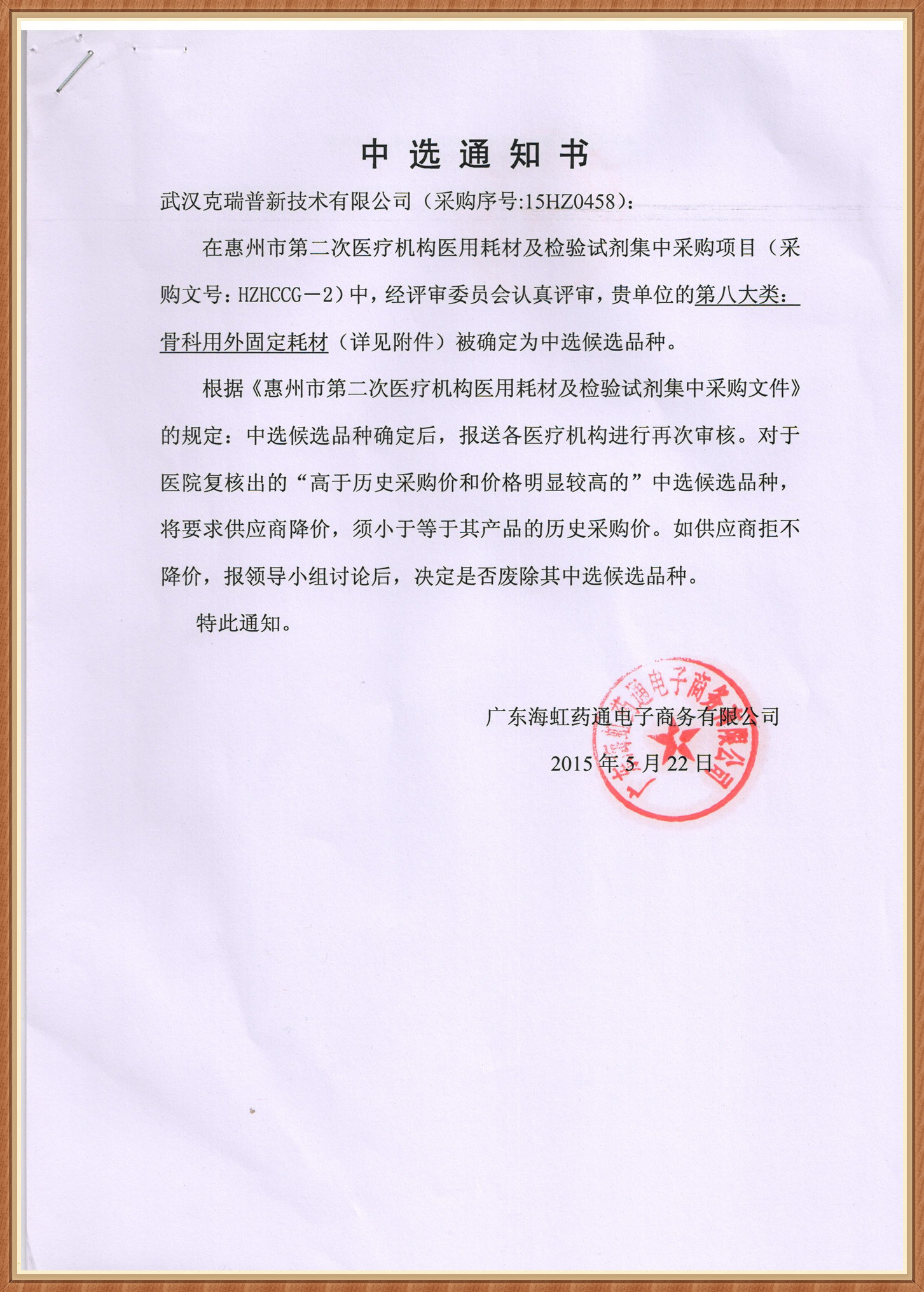 【廣東省惠州市第二次醫(yī)用機(jī)構(gòu)醫(yī)用耗材及檢驗(yàn)試劑集中采購項(xiàng)目中選通知書】我們武漢克瑞普根據(jù)惠州市第二次醫(yī)用機(jī)構(gòu)醫(yī)用耗材及檢驗(yàn)試劑采購項(xiàng)目進(jìn)行評(píng)選,我公司的骨科耗材成功通過了審核成為了中選產(chǎn)品。