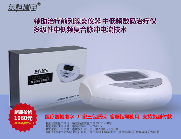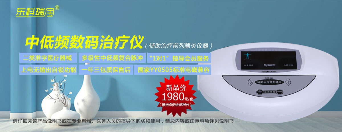 東科瑞寶牌中低頻數碼治療儀(輔助治療前列腺炎)采用多級性中低頻復合脈沖電流,根據前 列腺疾病治療的特性,由專門設計的電腦程序控制中頻脈沖電流3000Hz-至低頻脈沖電流370Hz之 間不斷變頻轉換,利用專用理療電極片等配件耗材輸出,并通過特定穴位經絡釋放,起到輔助治療 前列腺炎等疾病的作用。 東科瑞寶品牌治療儀器使用220v交流電源,符合國家YY0505標準電磁兼容有關要求,具有耐壓4000 伏和上電無輸出自鎖的安防功能,可適用于家庭、中小醫(yī)療機構、鄉(xiāng)鎮(zhèn)醫(yī)院、社區(qū)診所理療科室等。